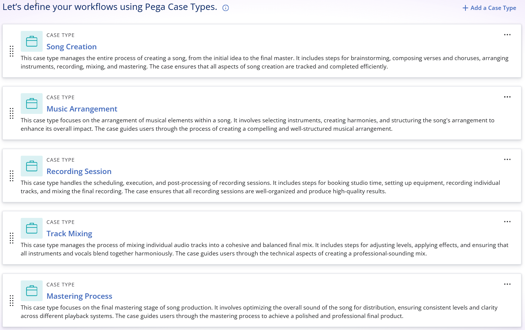 A high fidelity approach to case type design ensures that the technology solution accurately reflects the end-to-end customer journey—like ensuring every song serves the overall album narrative. The case types must align precisely with project scope whilst clearly defining the relevant business transaction and intended process flow, this is the opportunity to discard unnecesary case types or tracks or add in additional case types.