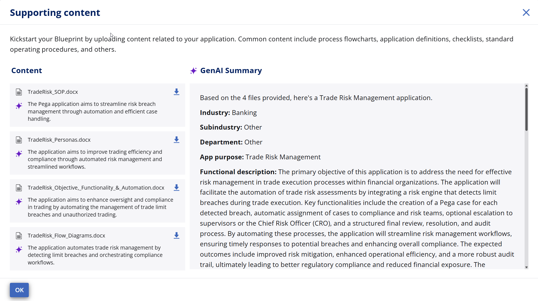 Blueprint is Pega's collaborative application design tool that leverages generative AI to accelerate the journey from business concept to working application. What traditionally took weeks of requirements gathering, stakeholder alignment, and technical specification can now be accomplished in days or even hours. By simply describing your business process and uploading supporting materials, Blueprint generates foundational assets—Case Types, Data Models, and Personas—that form the building blocks of your application.