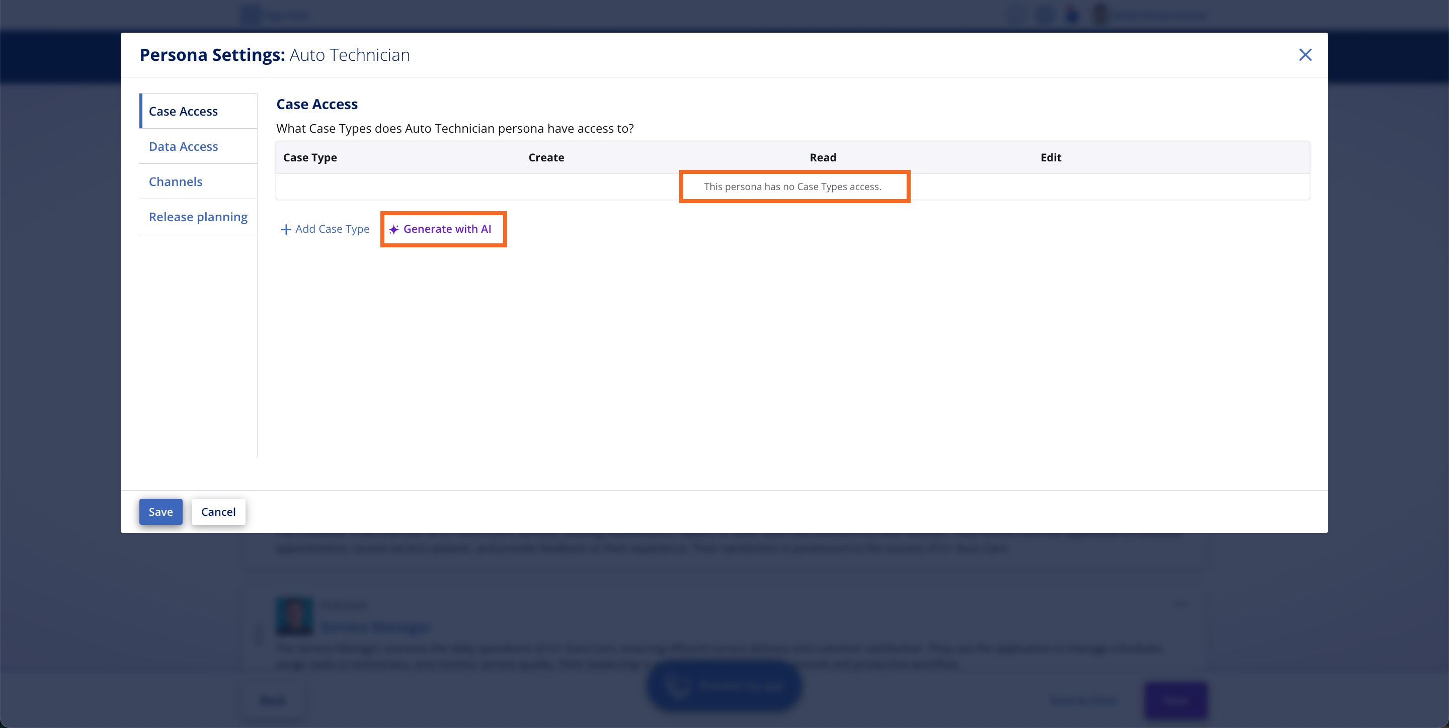 - Pega GenAI assistance on Access configuration: Get assistance from Pega GenAI to define access to different Cases and Data Objects for each of your Personas. You can review and update the access permissions suggested by Pega GenAI to meet your business needs.