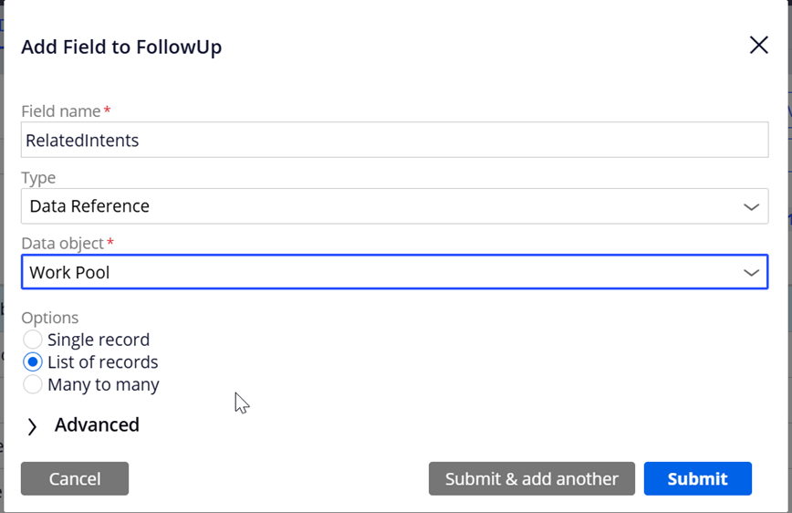 5. Once the DPages are configured, create a data reference field in the follow up case on WorkPool data object. Add the field to your view and you will be able to view the multi select list.