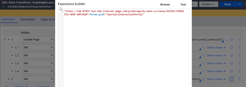 Sample URL - https://labinstance/prweb/app/my-bank-cs/cases/O1CMZU-MYBANKCS-WORK-GRP1%20S-13009?portal=InteractionPortal