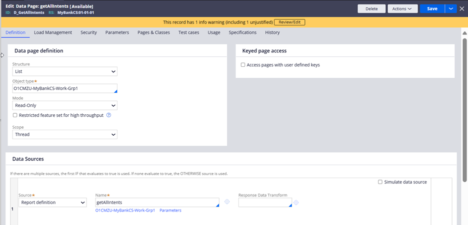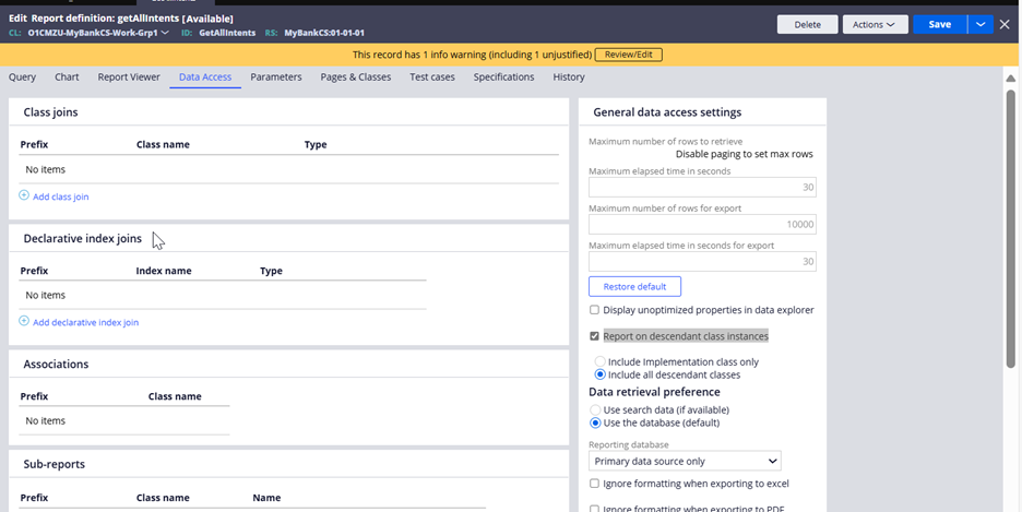 - Configure a Data page on the class group – D_GetAllIntents which is sourced from a Report Definition with “Report on descendant class instances” enabled. Ensure to fetch all the relevant columns.