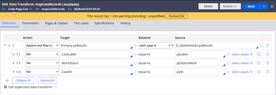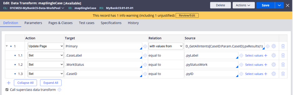 Note: To fetch a single case record, you can either parametrize D_GetAllIntents or create a new lookup data page.