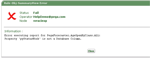 This can occur when the instance — for example, a work object — was saved in a table that lacks the appropriate columns. It can also occur when a list view or summary view rule is moved from one Process Commander system to another that has a different set of exposed database columns.
